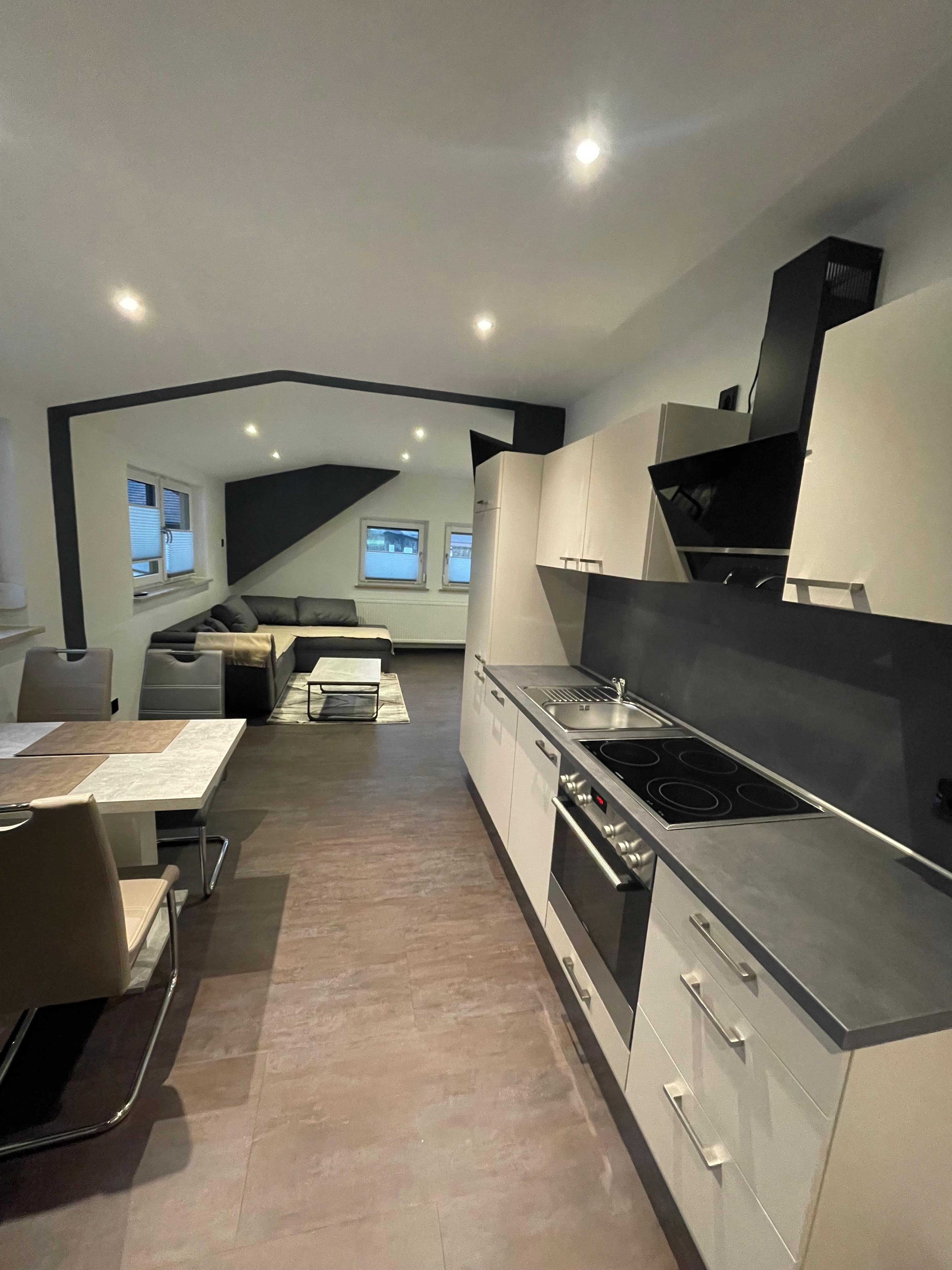 Ausgestattet ist diese Wohnung mit einer kompletten Wohnküche (mit Backofen, Cerankochfeld, Spülmaschine Kaffeemaschine, Toaster, Wasserkocher,